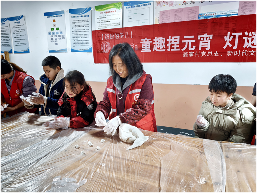 姜家村精心策划元宵节主题系列活动。当天上午,向日葵亲子小屋内暖意融融,家长们围坐交流育儿经验、日常护理等心得,与孩子携手制作花灯,大手牵小手粘贴组装,一盏盏可爱的花灯陆续成型,定格温馨亲子时光。下午,“童趣捏元宵 灯谜乐团圆”活动接续开展,青少年与巾帼志愿者共同制作灯谜卡片、布置灯谜墙,涵盖成语典故、民俗科普的趣味灯谜吸引大家踊跃竞猜。搓汤圆、品汤圆环节,更让大家在软糯香甜中感受团圆的温暖与幸福。